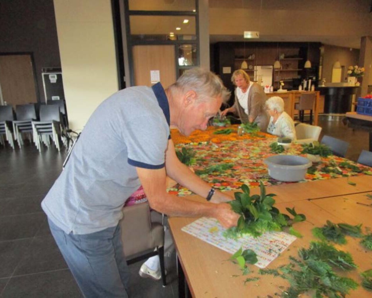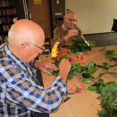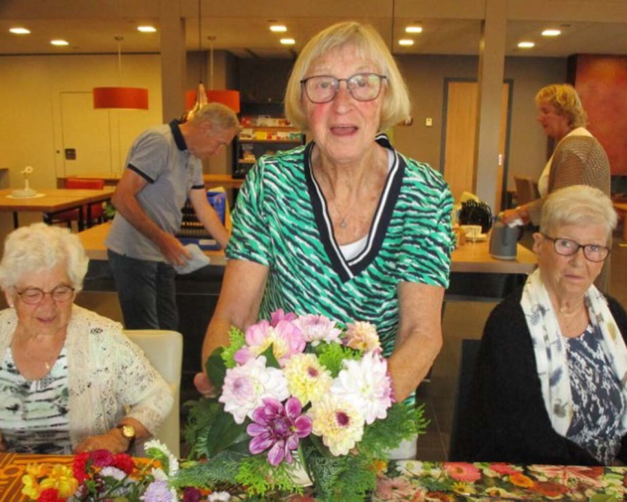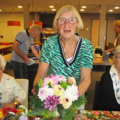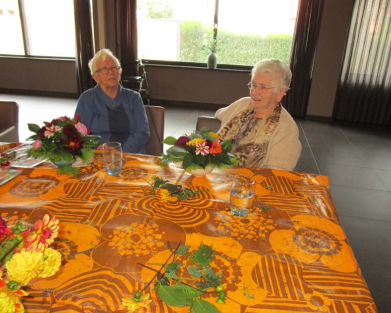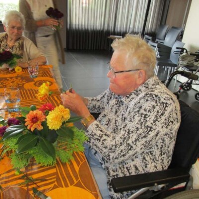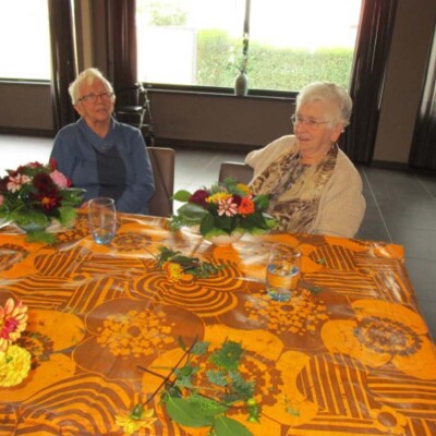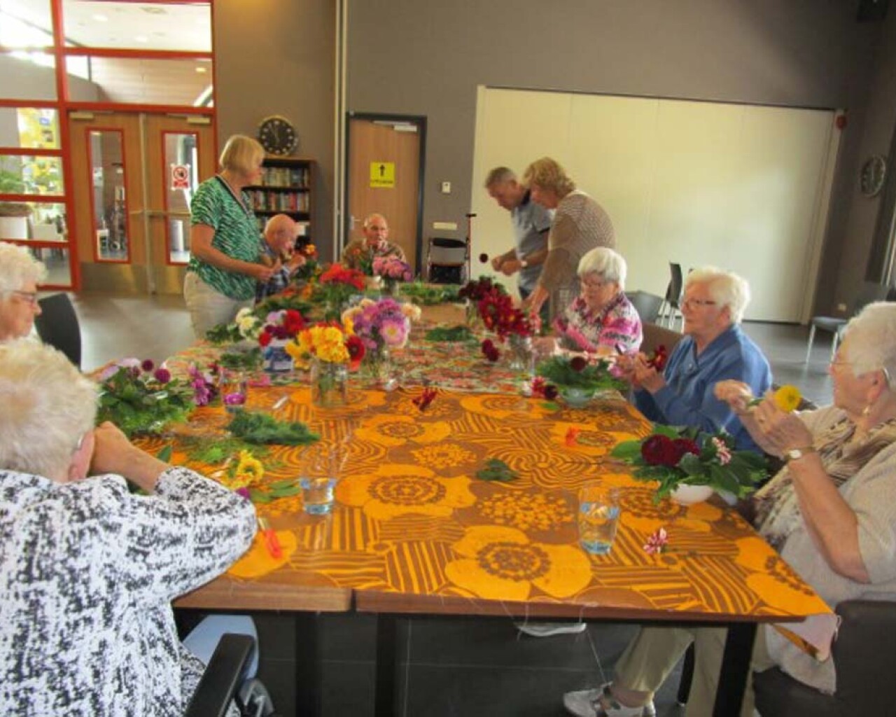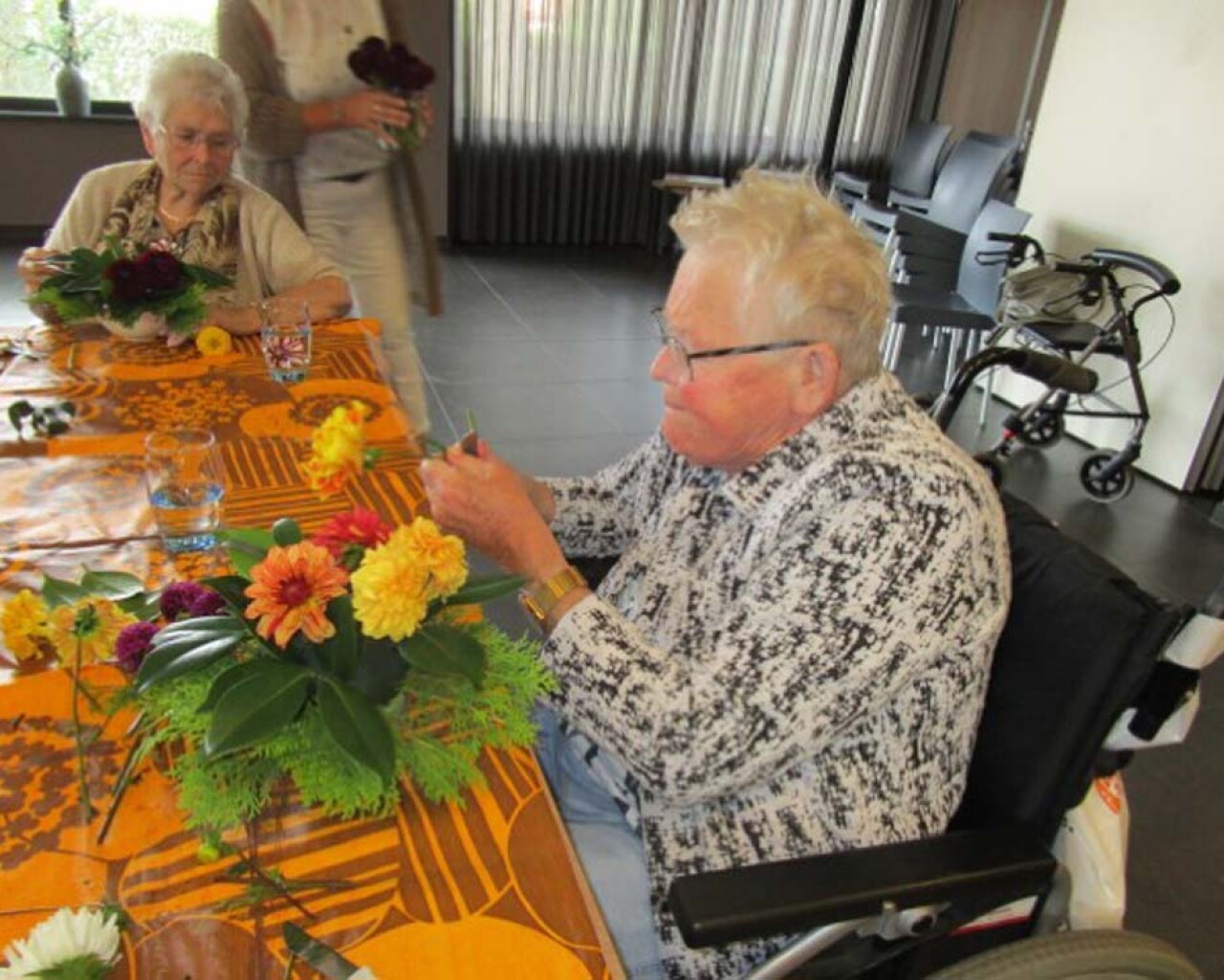 De gasten hebben een fleurig bloemstuk gemaakt. Alles uit eigen tuin!