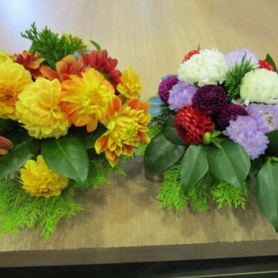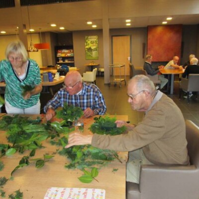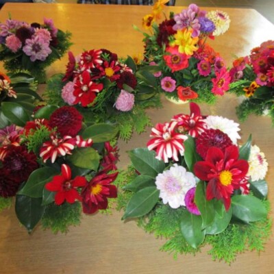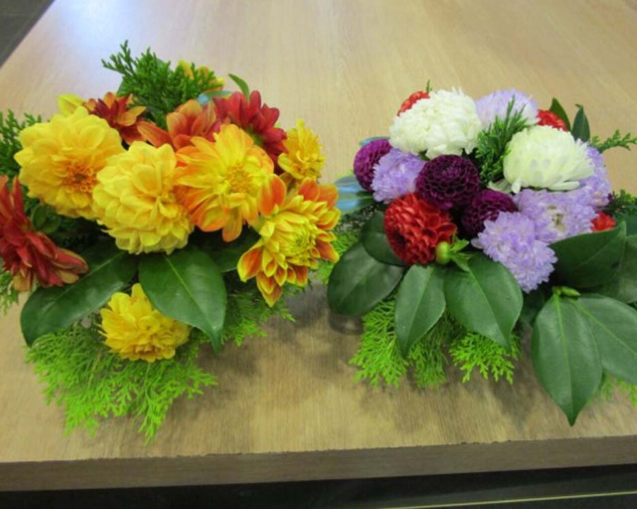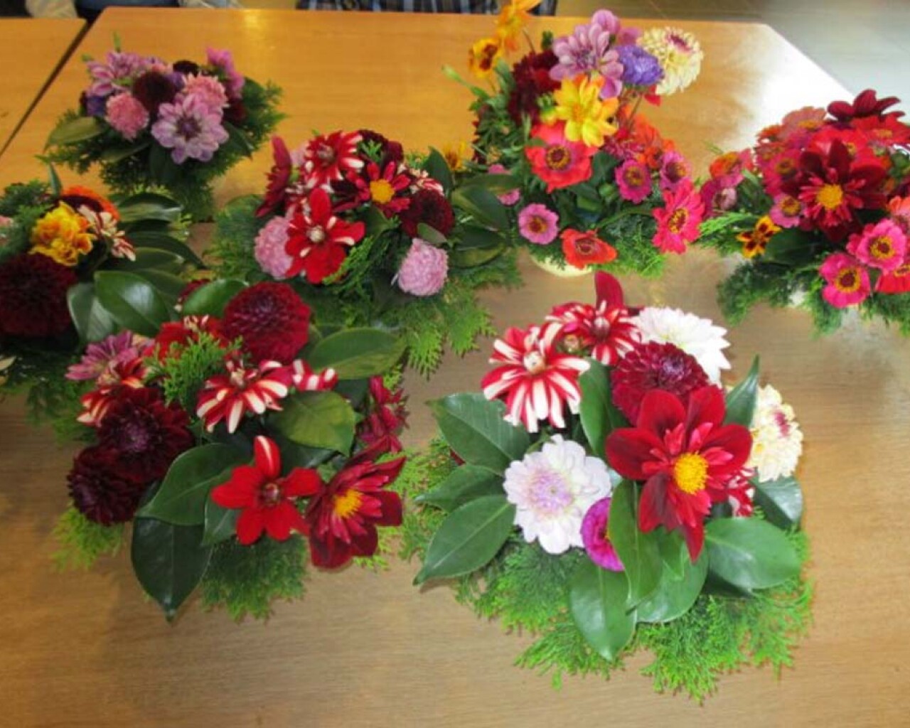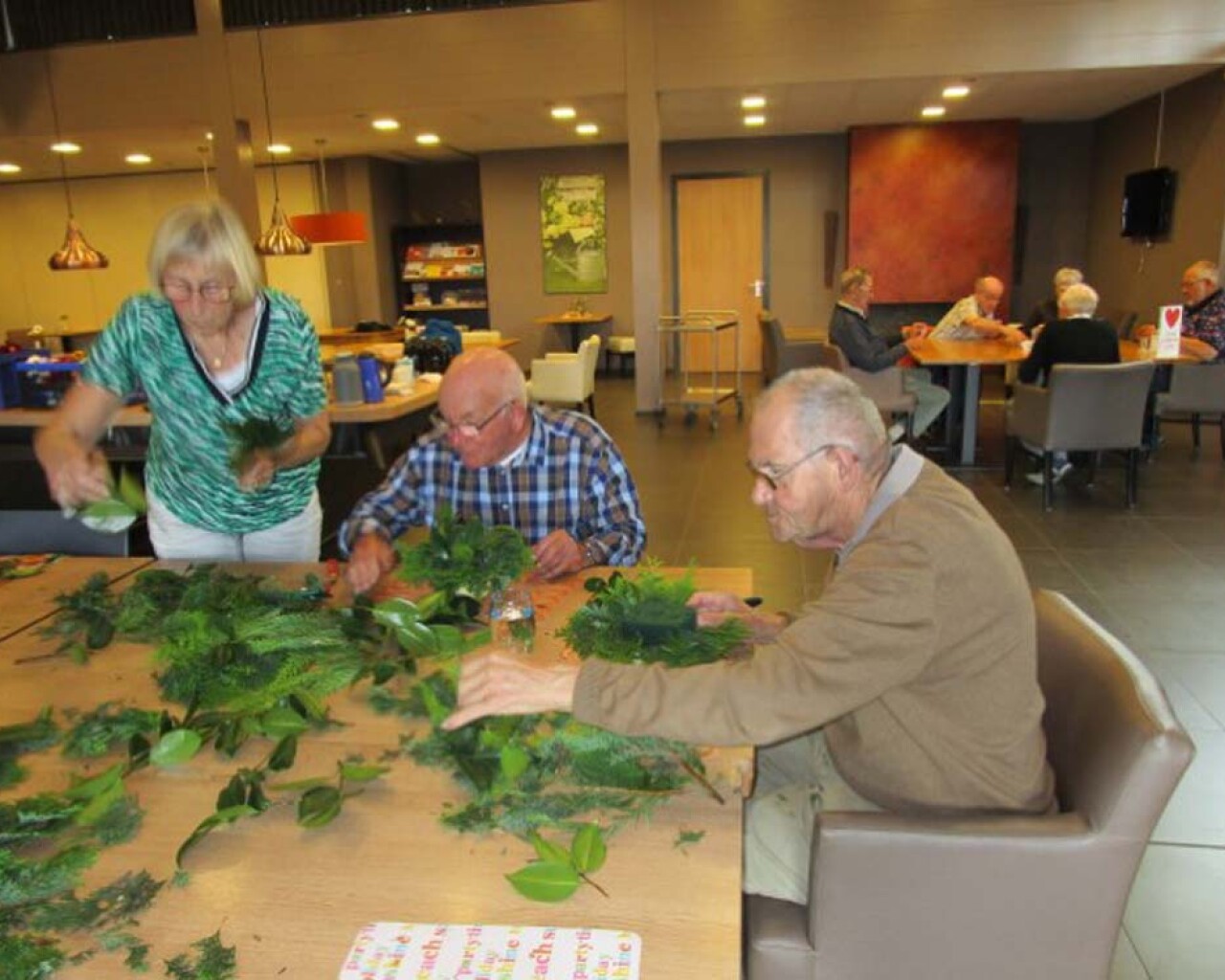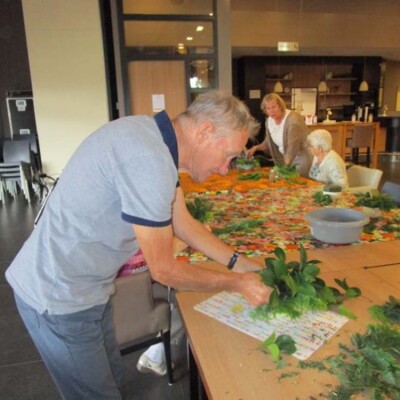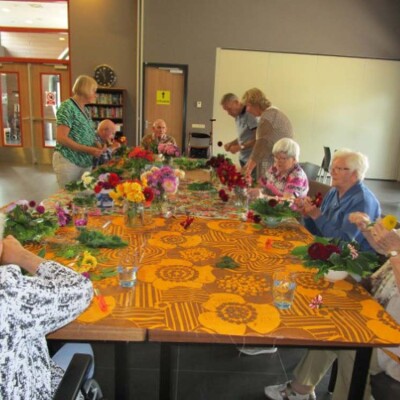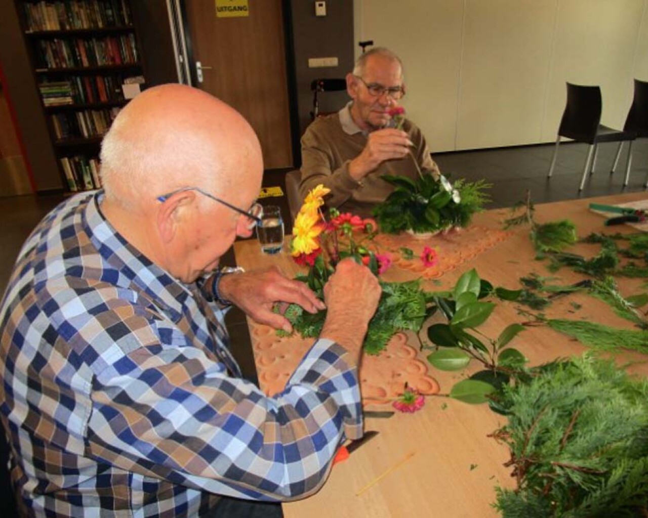 De gasten hebben een fleurig bloemstuk gemaakt. Alles uit eigen tuin!