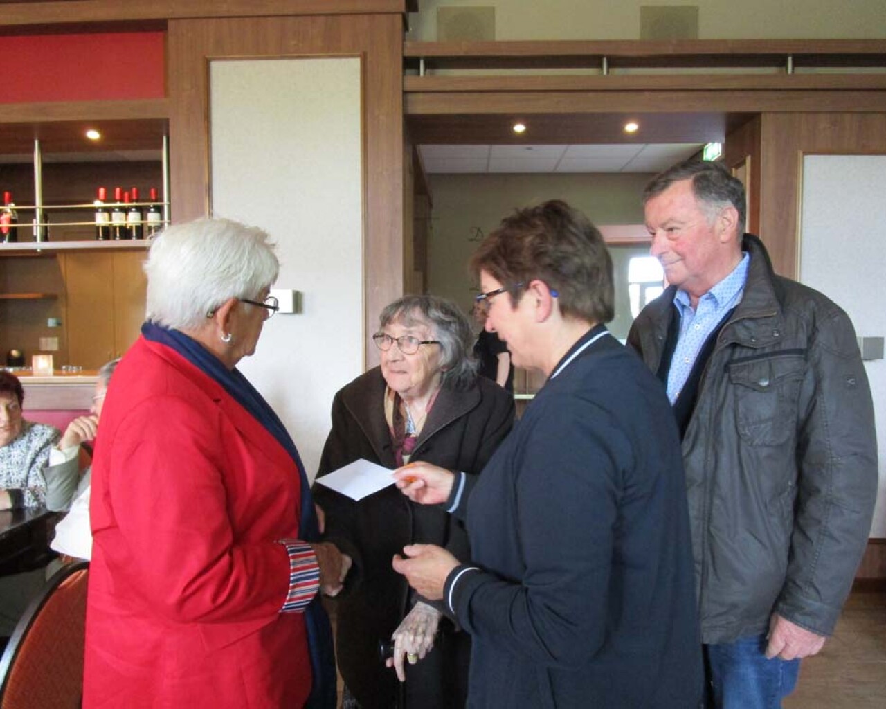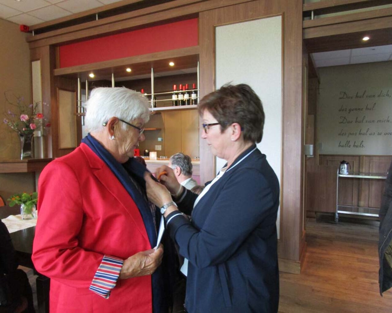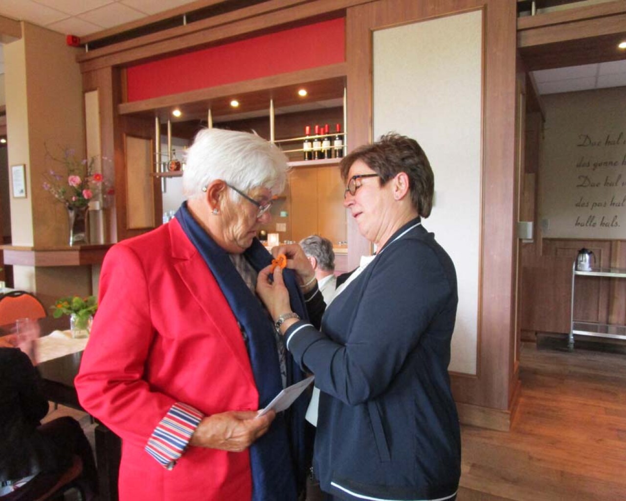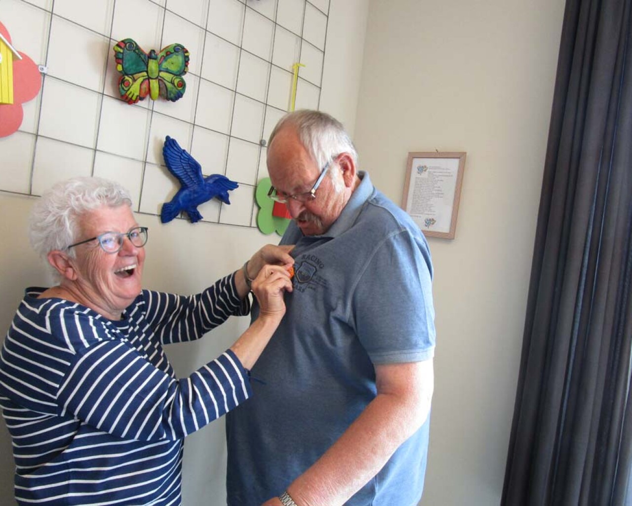 Onze vrijwilligster Ans Nelissen van de Hoeskamer heeft een welverdiende onderscheiding ontvangen, lid in de Orde van Oranje Nassau. Ook van de Hoeskamer kreeg Ans een mooi oranje gehaakt kroontje als onderscheiding voor al haar goede zorgen. Tevens kregen de gasten van Egchel ook een kroontje gemaakt door een inwoonster van Egchel. Bedankt hiervoor!