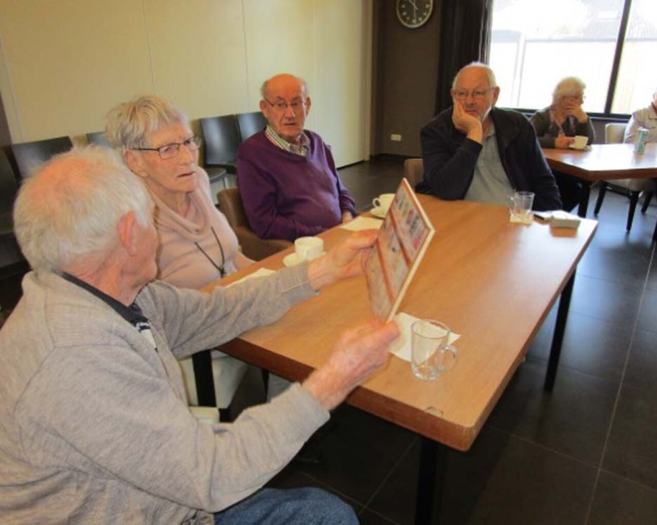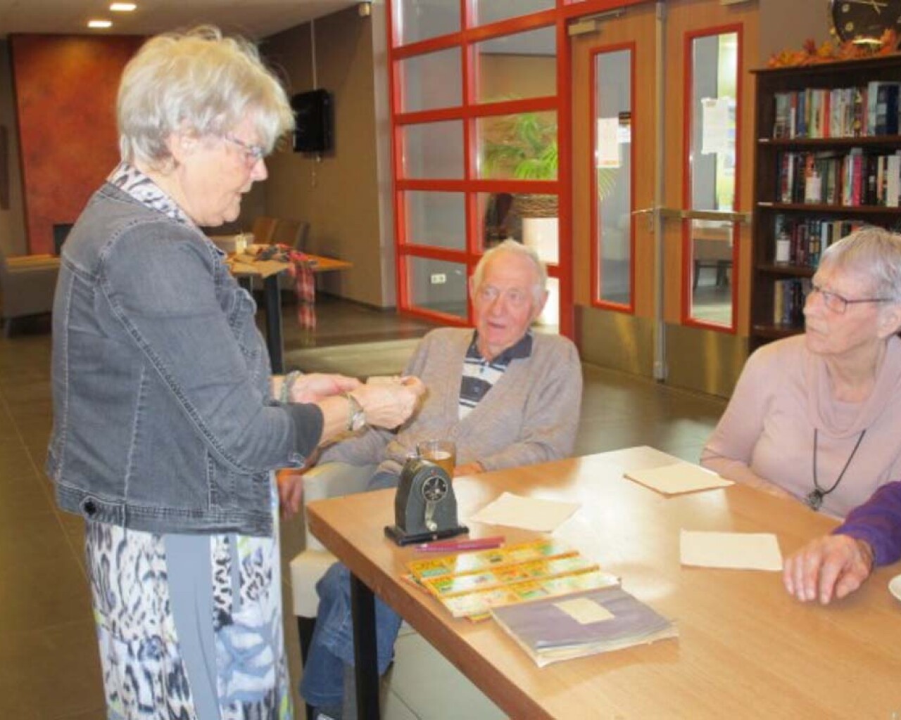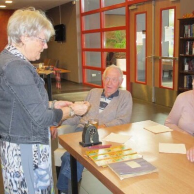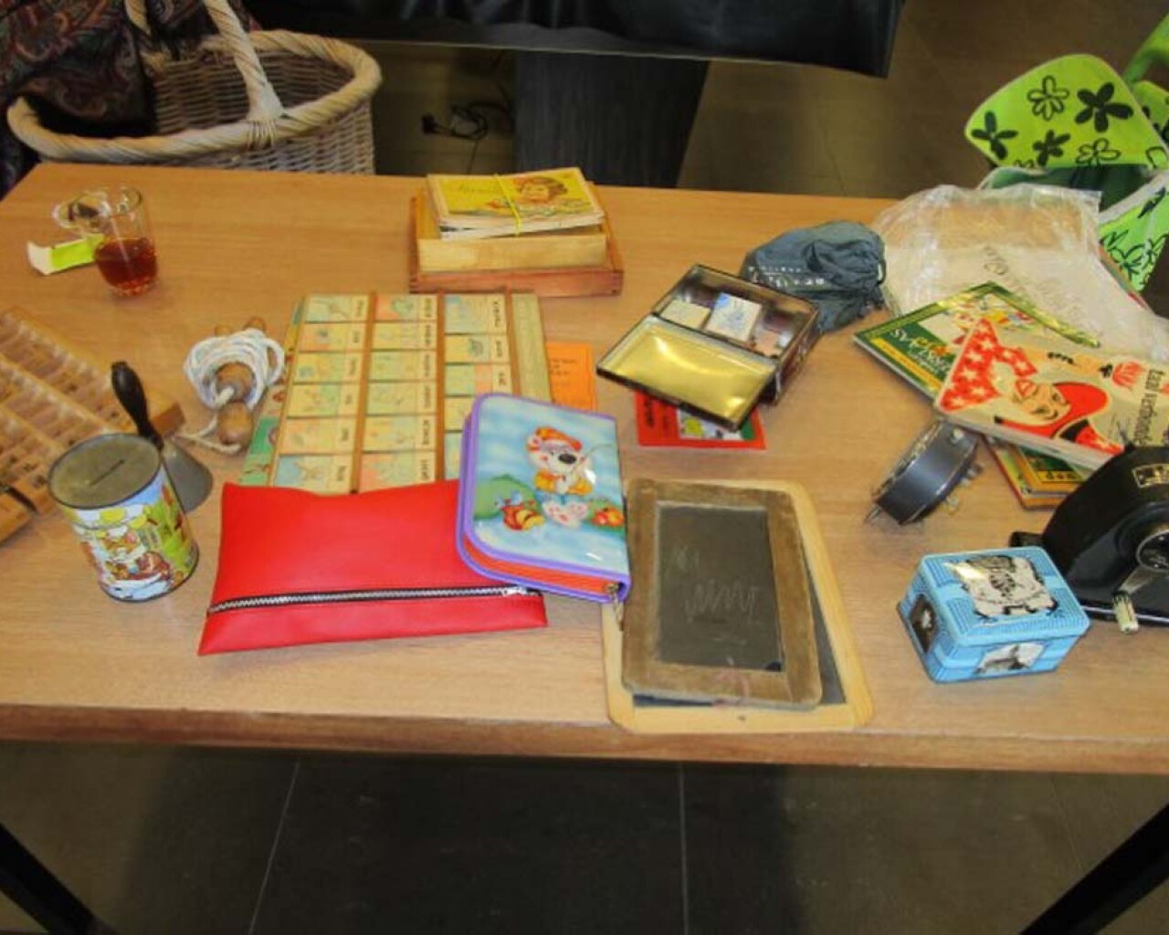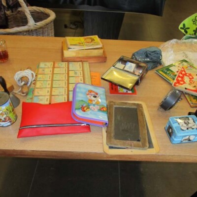 Terug in de tijd! Coby Houben kwam met materialen en verhalen over hoe het er vroeger aan toe ging op school. Heel herkenbaar voor iedereen met de leesplankjes, kroontjespen, letterdoos, poëziealbum, enz.