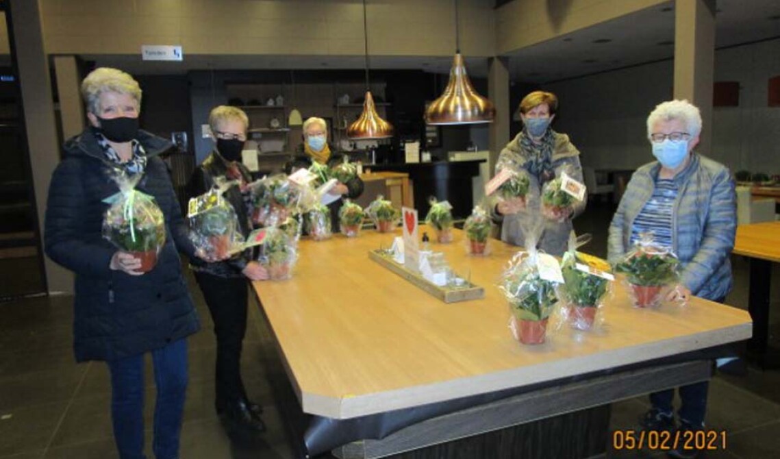 Om de gasten van "de Hoeskamer" wat op te fleuren kregen ze een bloemengroet bezorgd door enkele vrijwilligers.